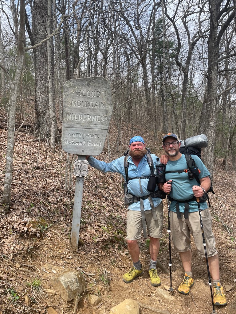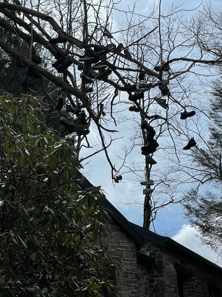 Adam and I entering the Blood Mountain Wilderness headed to Neel Gap.Blood Mountain ShelterIt is said that during the battle, Slaughter creek ran red with blood.Mountain Crossing at Neel gapThe shoes of hikers who ended their hike at Neel GapThe trail is getting tougher.