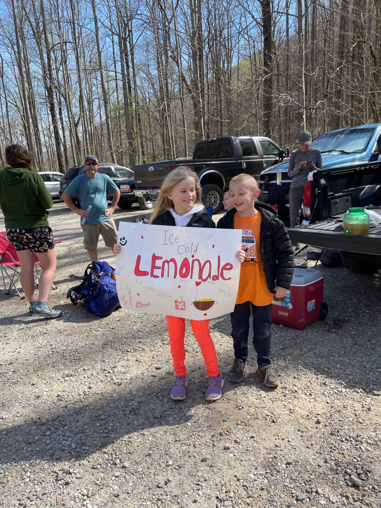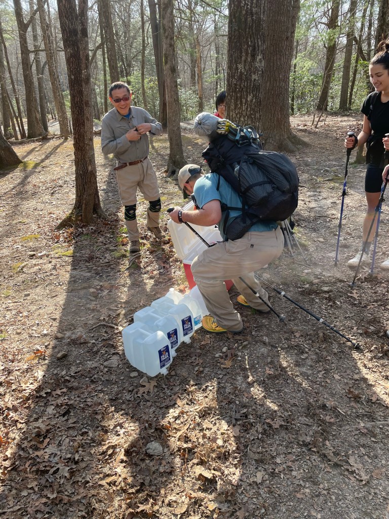 Quinton’s parents were supposedly doing trail magic about a mile and a half past the shelter at Gooch Gap. Trail magic is when people called “Trail Angels” provide food, drinks, and other small comforts at their own expense, to hikers along the trail. It is relished and deeply appreciated by hikers. There’ nothing better than coming around a bend of the trail to see coolers and water bottles left by Trail Angels. We looked forward to our first Trail Magic.