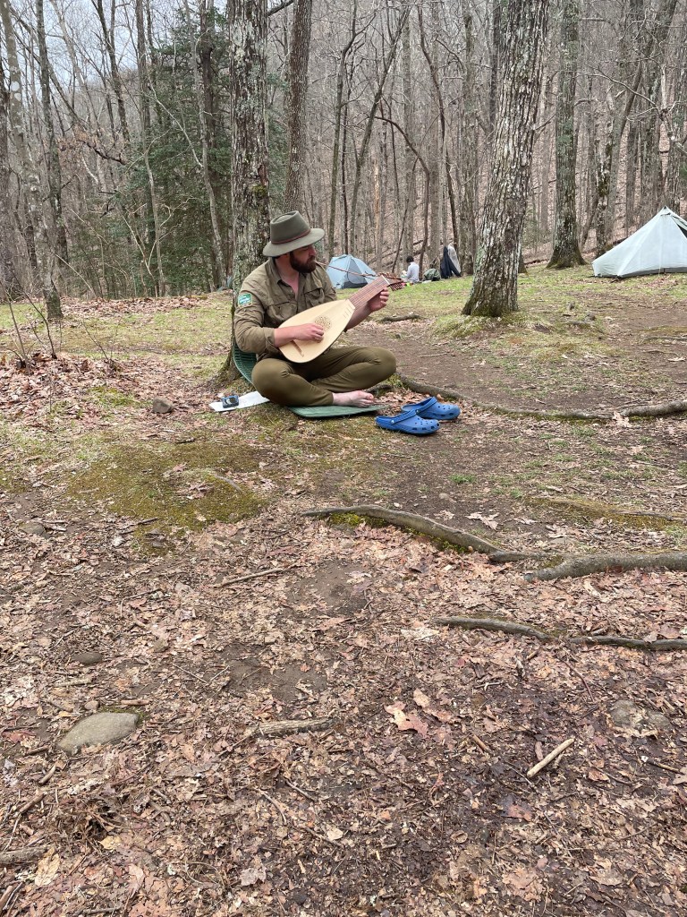Deep Gap Shelter, Deets is trying to dry out his tent with little success in the cool muggy weather.This guy is carrying his Lute on the outside of his pack wrapped in a tarp. He calls the Lute Georgia, he speaks to it and talks about it as if it were a person. He played it beautifully though, listening was a treat.